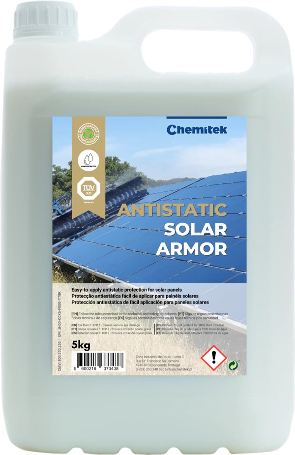 Its antistatic properties reduce the adhesion of dust to the glass, while keeping the solar glass cleaner between cleanings, and increasing the efficiency of the next wash as well as boosting energy production by up to 5%.